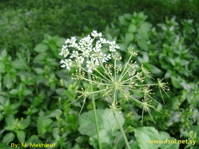 نبات عشبي حولي، طوله 20- 60 سم، الساق عليها أخاديد، يحمل أوباراً متجهة لأسفل. الأوراق ذات أعناق غمدية، الأوراق السفلى مركبة ثلاثية إلى وريقات قرصية، والعلوية بسيطة قلبية، طولها 5- 7 سم، حواف الأوراق مقوسة. شماريخ النورات طولها 15- 37 سم، الخيمات قطرها 8 سم، القنابات عديدة، شريطية، طولها 10- 13 مم، تحمل أوباراً ، الأشعة عديدة، غير متساوية، تحمل أوباراً خفيفة، القنييبات عديدة، 3 أطول بكثير من الباقية، الأزهار الخارجية غير منتظمة، طول بتلاتها 0,5- 1 سم، بيضاء. الثمار قرصية – بيضاوي، 2- 4 مم، عليها ثآليل دقيقة، ذات حافة عريضة.