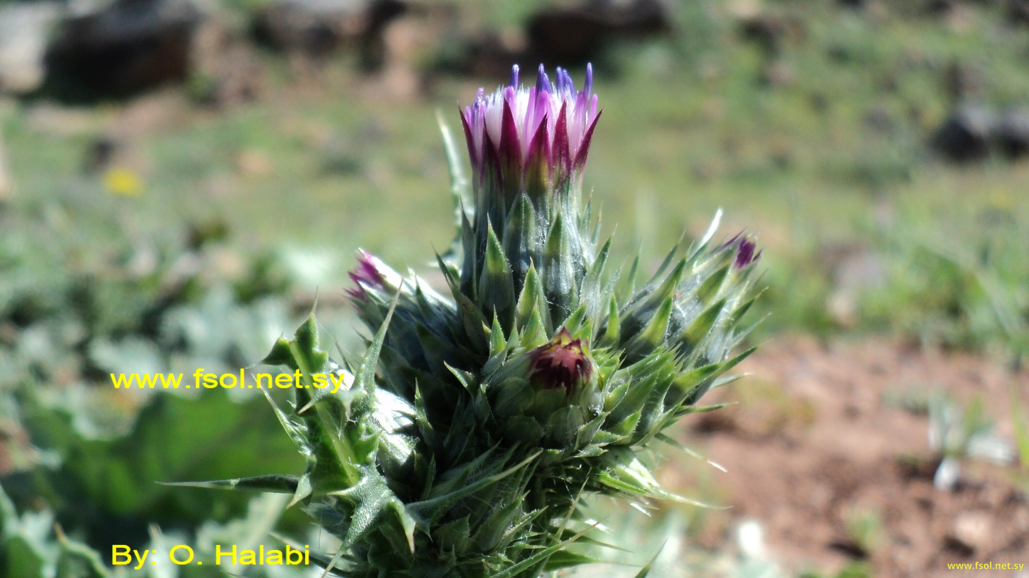 ات عشبي، طوله 20 سم، مغطى بأشواك قاسية وأوبار عنكبوتية. الأوراق لاطئة، طولها 2- 5 سم، مفصصة ريشية، مشوكة. الرؤيسات طرفية وجابنية، طولها 17مم، وعرضها 10 مم تتكون في مجموعات 2- 3 هامات، محمولة على شماريخ قصيرة أو شبه لاطئة، محاطة بقنابات رمحية مشوكة، مغطاة بأوبار عنكبوتية، القنابات الخارجية أطول من الداخلية بالتدريج. الأزهار إنبوبية ذات فصوص عميقة، لونها زهري، طولها 11مم. الثمار سبسلاء، متطاولة، طولها5 مم بنية فاتحة وبها خطوط داكنة، سطحها العلوي مستو، المناثير ملتصقة من الأسفل.