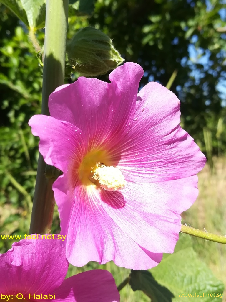نبات عشبي معمر، جذاب، طوله 70- 200 سم، ساقه قائمة، تحمل أوباراً . الأوراق بسيطة معنقة، طولها 6- 15 سم، قرصية- بيضاوية، مفصصة كفية، الفصوص غير عميقة، الحافة دقيقة التسنن. الأزهار كبيرة الحجم 8- 12 سم، لونها زهري، مرتبة على طول الساق الرئيسة تحتوي على زوائد فوق كأسية. الثمار منشقة، عديدة.