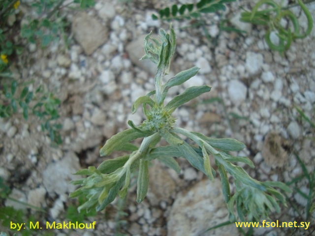 نبات عشبي حولي، 5- 30 سم، قائم، يحمل أوباراً كثيفة مبيضة. الأوراق1- 1,5 سم، ببضاوية مقلوبة- متطاولة إلى ملعقية. الهامات تتجمع في رؤوس طرفية وجابنية قطرها5- 6 مم. القنابات الغلافية 6 صفوف، بيضاوية مقلوبة – رمحية، 3,5- 5 مم، القمة مدببة طويلة، تحمل أوباراً كثيفة. الأزهار الخارجية مؤنثة، التويج خيطي، 2 مم، المبيض متطاول، عديمة المناثير الأزهار الداخلية خنثى، التويج 2,25 مم، 4 فصوص، ذات مناثير خشنة, الثمار 0,5- 0,8 مم بيضاوية – متطاولة إلى إسطوانية.