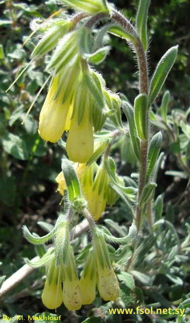 نبات عشبي معمر، طوله حوالي 30 سم، ساقه محمرة، تحمل أوباراً كثيفة. الأوراق شريطية لاطئة، طولها 1,5 – 3 سم، النورة طرفية، محدودة، متفرعة، ذات قنابات شريطية- رمحية طول الأزهار 2 سم، متدلية، لونها أصفر. السبلات شريطية- رمحية، طولها 1سم، تحمل أوباراً ، التويج أنبوبي، طوله 18 - 20 مم، ذو 5 أسنان قصيرة مثلثية، تحمل أوباراً خفيفة، الأسدية ملتصقة بمنتصف الأنبوب، الخيوط عريضة، المآبر شريطية، طولها 8 مم. القلم بارز. الثمار 4 بنيدقات.