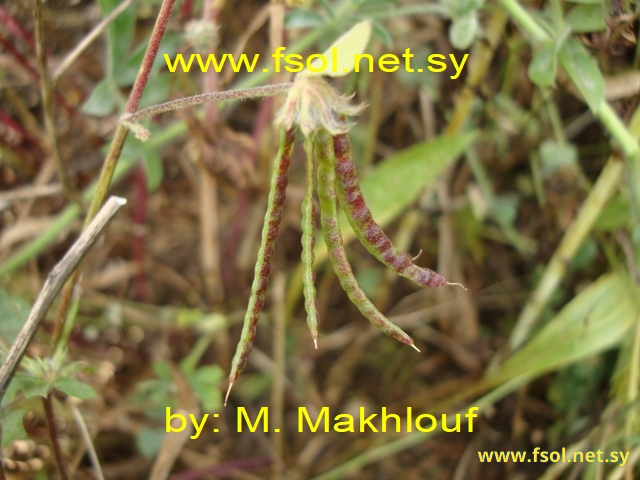 نبات عشبي حولي، 15- 50 سم، يحمل أوباراً دقيقة. الأوراق خماسية، الوريقات العلوية 8- 18 مم، بيضاوية مقلوبة، الزوج السفلي أصغر. الشماريخ أطول قليلاً من الأوراق الداعمة تحمل 3- 5 أزهار، القنابات 3، أطول من الكأس، بيضاوية. الكأس ثنائي الشفة، أسنانه غير متساوية. التويج 1 سم، أطول من الكأس، أصفر، العلم يساوي طول الأجنحة، الزورق أقصر ومنحني بشدة. القرن 2- 4,5 سم، متخصر بين البذور, شريطي، مسطح، البذور 2 مم، بنية داكنة، ملساء.
